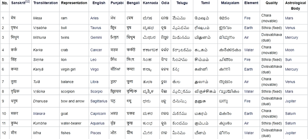 निरयण, या साइडरियल राशि, एक काल्पनिक 360 डिग्री बेल्ट है, जो सायन, या उष्णकटिबंधीय राशि चक्र की तरह, 12 समान भागों में विभाजित है। प्रत्येक भाग को एक संकेत या राही कहा जाता है। माप की विधि में वैदिक (ज्योति) और पश्चिमी राशि भिन्न हैं। यद्यपि दो प्रणालियां एक जैसे हैं, ज्योतिष मुख्य रूप से साइडरल राशि का उपयोग करता है (जहां सितारे निश्चित पृष्ठभूमि को ध्यान में रखते हैं जिसके खिलाफ ग्रहों की गति को मापा जाता है), जबकि अधिकांश पश्चिमी ज्योतिष का उपयोग करता है उष्णकटिबंधीय राशि चक्र। (वसंत विषुव पर सूर्य की स्थिति के संबंध में ग्रहों की गति को मापा जाता है)। दो हजार वर्षों के बाद, विषुव के संरक्षण के परिणामस्वरूप, एक्लिप्टिक देशांतर का मूल स्थान 22 डिग्री तक स्थानांतरित हो गया है। परिणामस्वरूप, ज्योतिष प्रणाली में ग्रहों का स्थान काफी हद तक नक्षत्रों के साथ संरेखित होता है, जबकि उष्णकटिबंधीय ज्योतिष शास्त्र सॉलिसिटी और विषुव पर आधारित है।